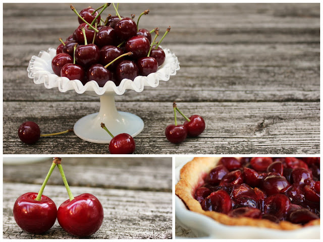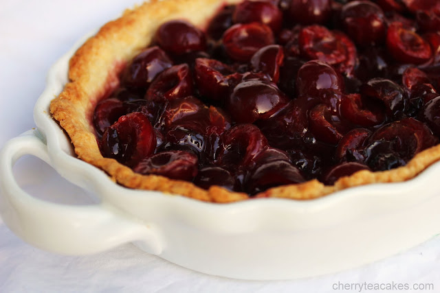 Pit the cherries, then arrange most of them in the baked crust. Leave out about 1/3 cup.